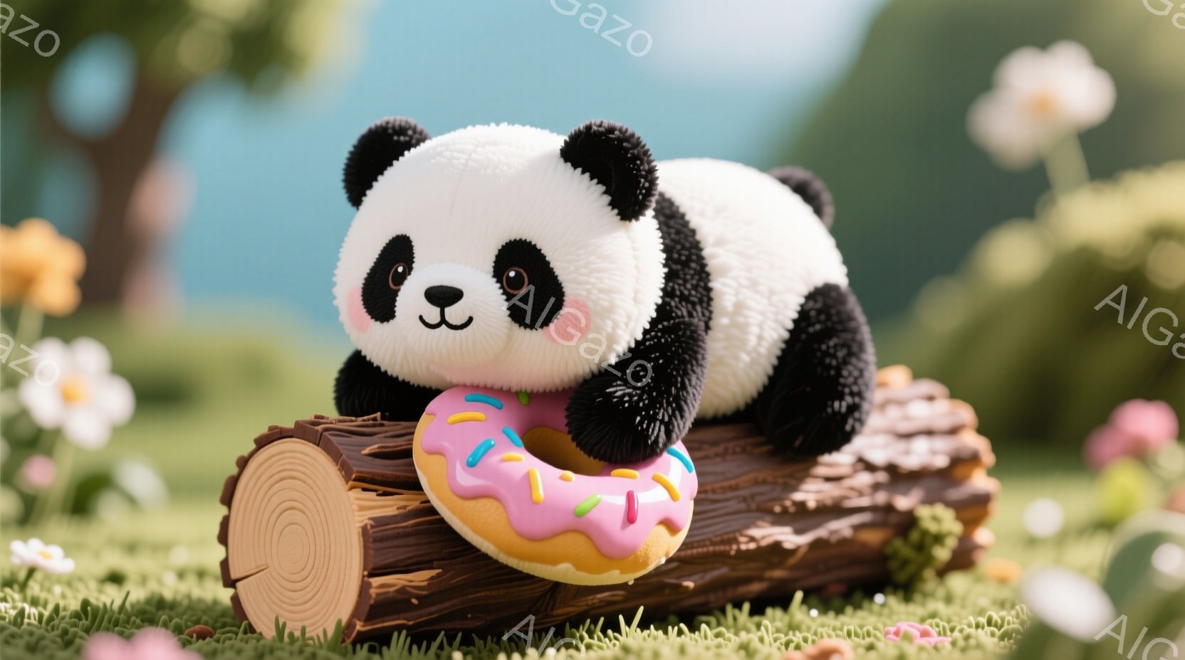 パンダがドーナツ型の木の枝の上に横たわっており、とてもリラックスした様子です。背景には緑の芝生と様々な色やトッピングのドーナツが点在し、春らしい柔らかな光が差し込んでいます。全体的に可愛らしく、夢のような雰囲気が漂っています。