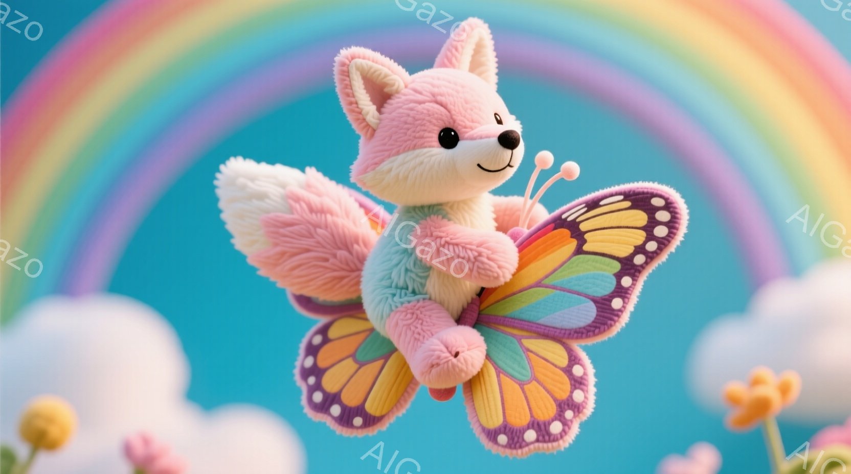 ふわふわのピンク色のキツネが、虹色の蝶の翼を背中に付けて空中に浮かんでいます。キツネは愛らしい表情で、小さな手で翼を支えているようです。背景には緑の草と白い花が咲き、暖かく穏やかな雰囲気を醸し出しています。