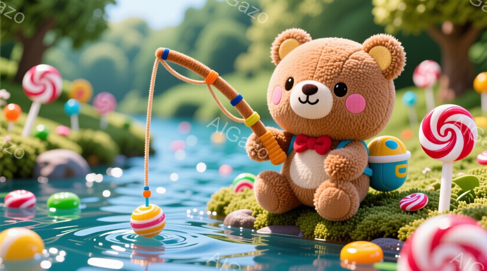 ふわふわの茶色のクマが青いサスペンダーと赤い蝶ネクタイを着て、緑の芝生の上に座って釣りをしています。背景にはカラフルなキャンディや花が咲き乱れ、水面には水滴が弾けており、全体的に夢のような可愛らしい雰囲気です。クマは穏やかな表情で、楽しそうに釣りの糸を操っています。