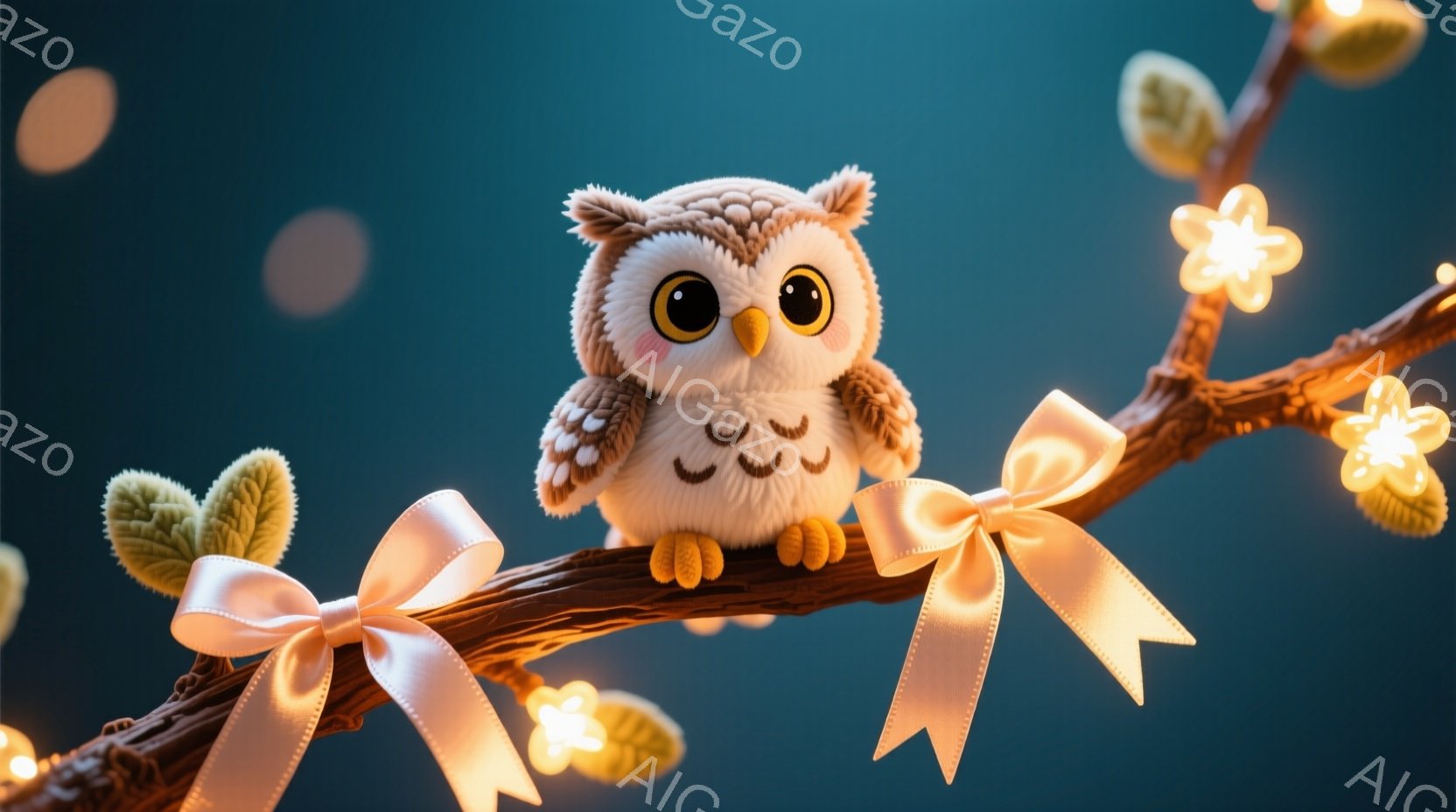 ふわふわの茶色のフクロウが木の枝に座っています。大きな丸い目で優しそうな表情をしており、小さな手は前に組み合わされています。枝には柔らかいクリーム色のリボンが巻き付けられ、周りには芽吹き始めた春の木々が描かれ、暖かい光が灯されています。