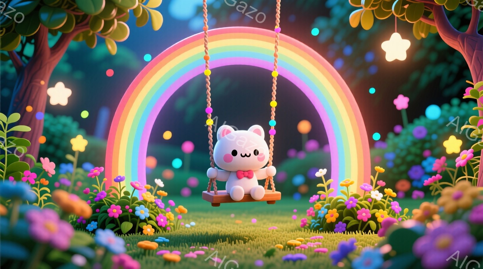 白いふわふわした動物のキャラクターが、虹色のブランコに乗って楽しんでいます。キャラクターはピンクの服を着ており、つぶらな瞳と穏やかな表情をしています。背景には色とりどりの花々が咲き乱れ、雲のような形の木々が立ち並び、全体的に夢のような、可愛らしい雰囲気が漂っています。
