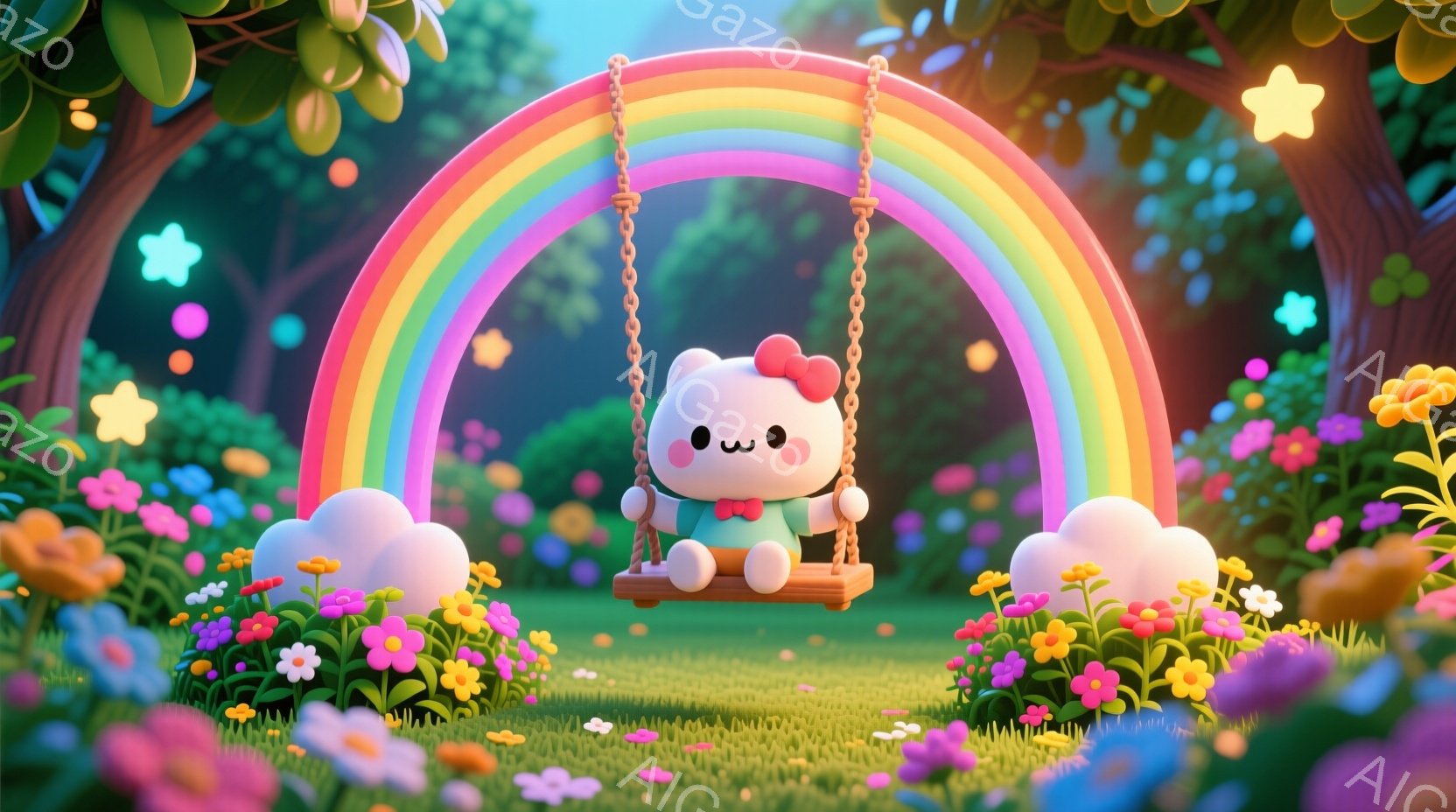 ふわふわの白い子ウサギが、虹色のブランコに座ってリラックスしています。ピンクのリボンをつけており、可愛らしい表情で、周囲にはパステルカラーの花々が咲き乱れています。背景には緑豊かな木々と、雲のような白いふわふわのオブジェクトがあり、夢のような優しい雰囲気を醸し出しています。