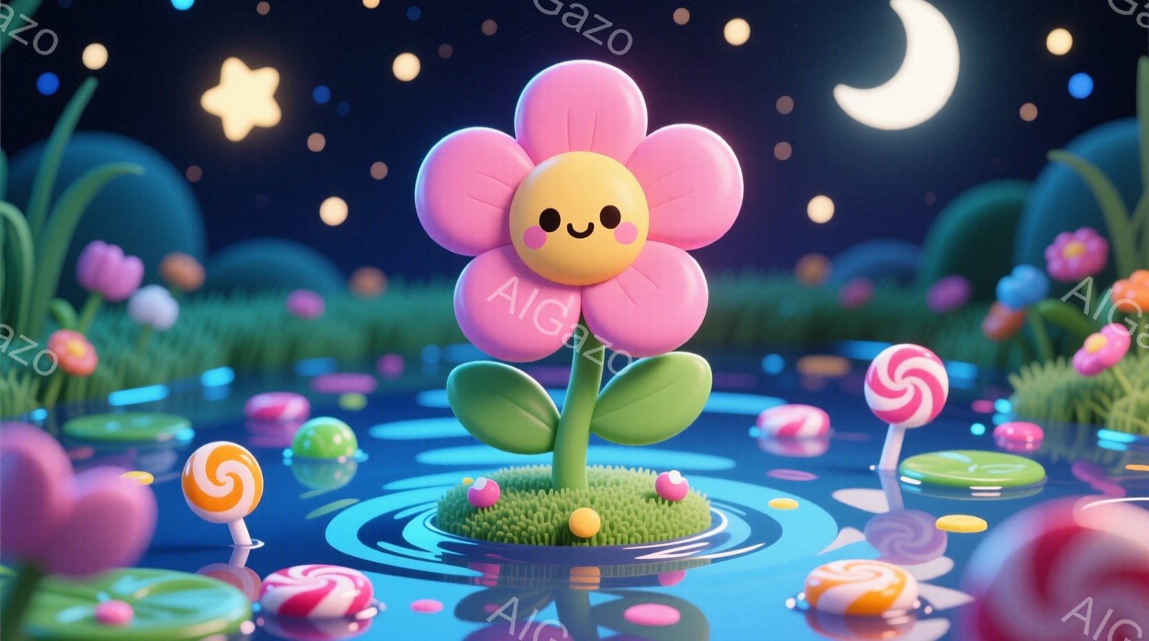 明るいピンク色の花が、水面に浮かぶ緑色の葉の上に立っている。周りにはキャンディが水面に浮かび、背景には夜空と月、星が散りばめられている。全体的に可愛らしく、夢のような雰囲気が漂っている。