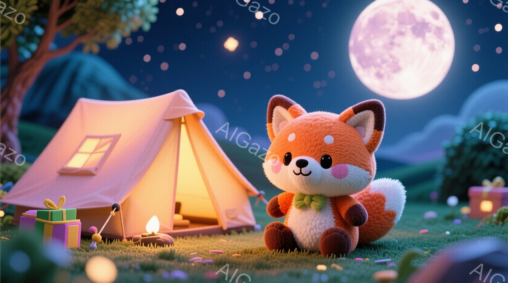 オレンジ色の可愛らしいキツネが、緑の蝶ネクタイを身につけ、丸太の周りに座ってマシュマロを焼いている。背景には、テント、丘、そして満月が夜空に輝き、草の上には小さな光が点在している。全体的に温かく、穏やかな、おとぎ話のような雰囲気で、キャンプを楽しんでいる様子が伝わってくる。