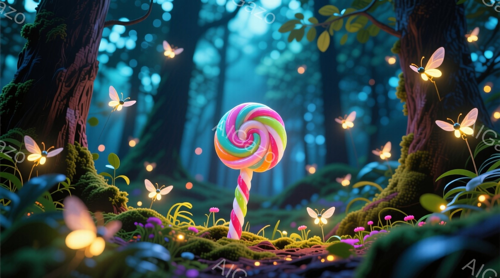 鮮やかな色彩のキャンディが、緑豊かな森の中に生えている奇妙な光景が描かれている。背景には苔むした木々が生い茂り、小さなキノコや植物が点在し、夜空には発光する小さな虫たちが舞っている。全体的に幻想的で、まるで夢の中にいるかのような、遊び心に満ちた雰囲気である。