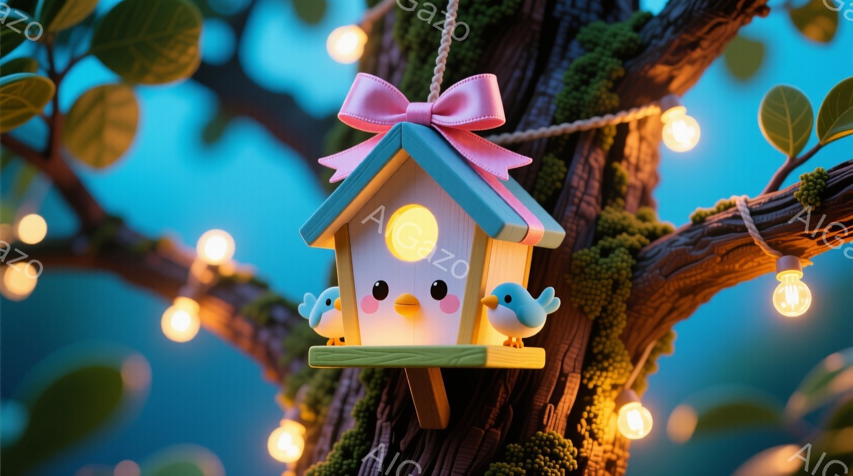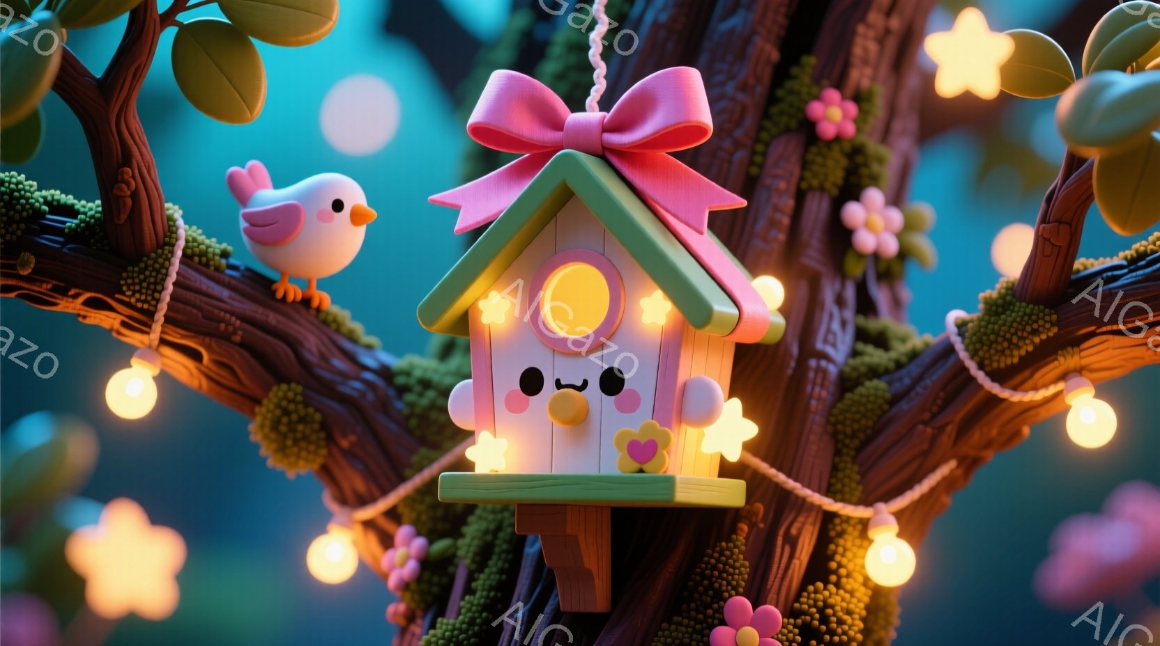 可愛らしい小鳥の巣箱が、苔むした木の枝に設置されています。巣箱には愛らしい表情が描かれており、優しい光が灯っています。背景にはぼやけた花々や点在する光が散りばめられ、暖かく幻想的な雰囲気を醸し出しています。