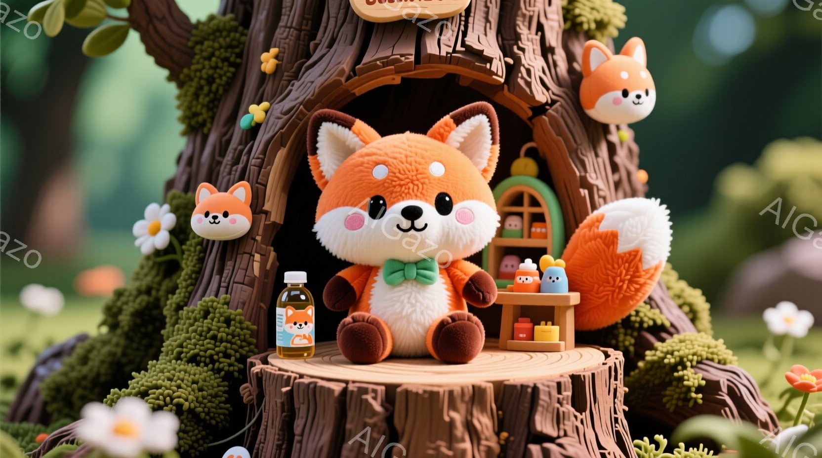 キツネのキャラクターが、木の洞窟のような店を構えています。キャラクターは水色の蝶ネクタイと白い襟付きの服を着ており、明るい笑顔を浮かべています。背景には、緑豊かな草原と花々が広がり、暖かく、ファンタジーのような雰囲気が漂っています。