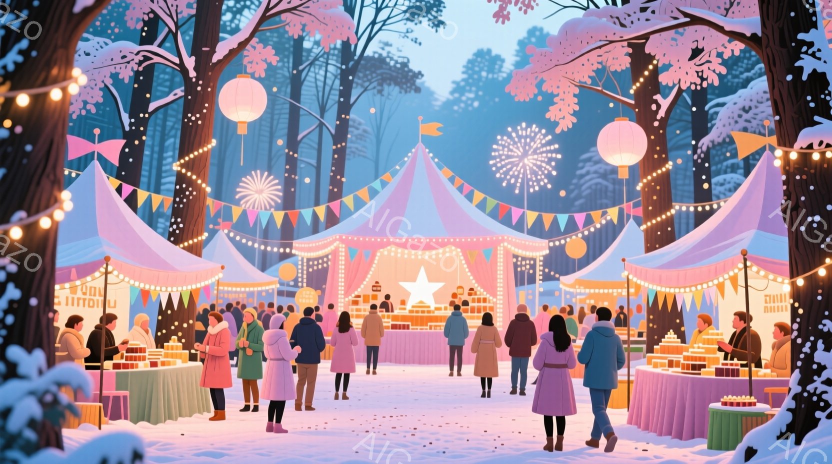 鮮やかな色彩で描かれたこのイラストは、屋外の祭りを表しています。人々はカラフルな服装で、歓談したり、パフォーマンスを楽しんだりしています。背景には、提灯や旗が飾られた屋台が並び、自然豊かな風景が広がっています。