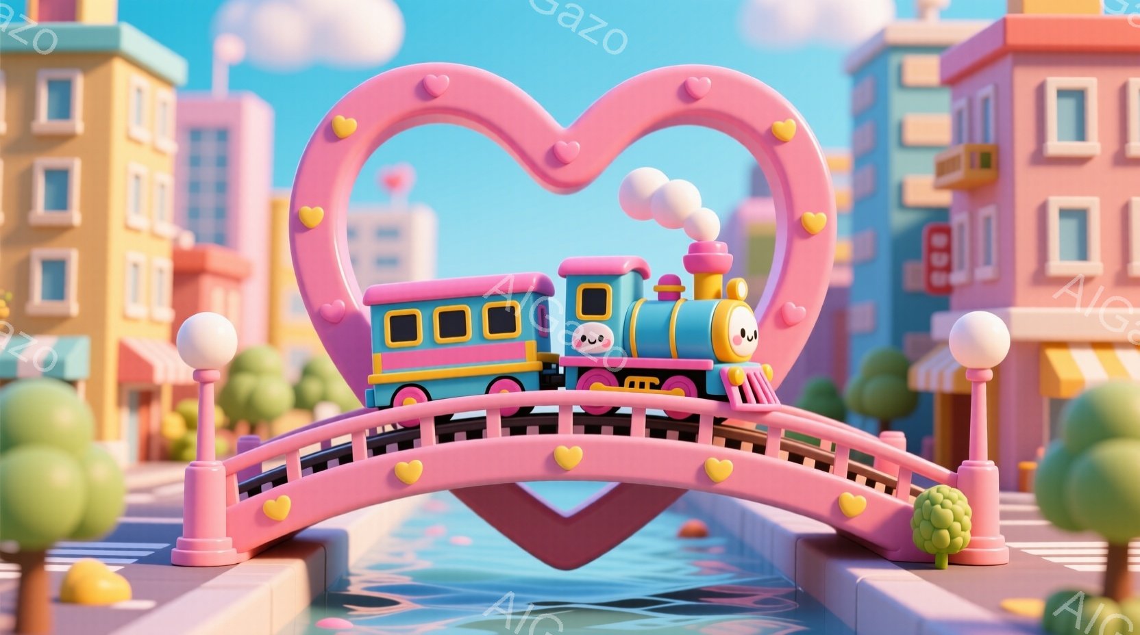 鮮やかなパステルカラーで彩られた、おとぎ話のような風景です。青い機関車がピンク色のハート型の橋を渡っており、可愛らしい表情をしています。背景には、カラフルな建物と緑の草地が広がり、穏やかで夢のような雰囲気を醸し出しています。