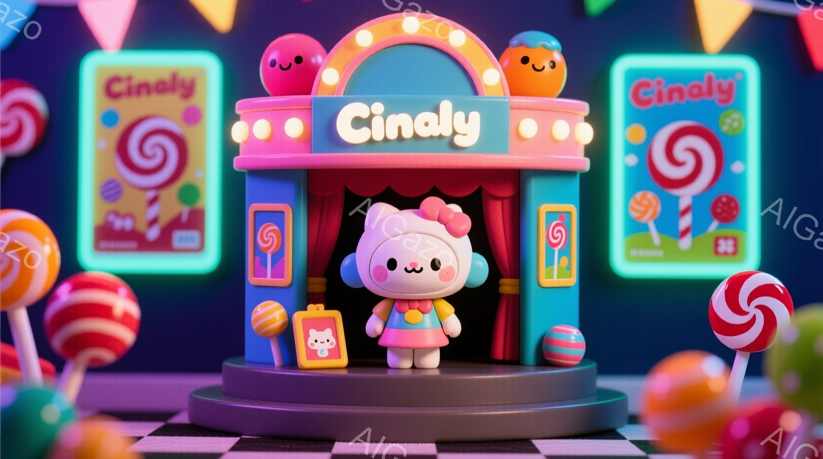 ふわふわした白い雲のようなキャラクターが、ピンク色の服を着てステージに立っています。背景にはキャンディのイラストが描かれたポスターが飾られ、全体的に明るく甘い雰囲気です。ステージはカラフルなブロックで装飾され、まるで遊園地のアトラクションのようです。
