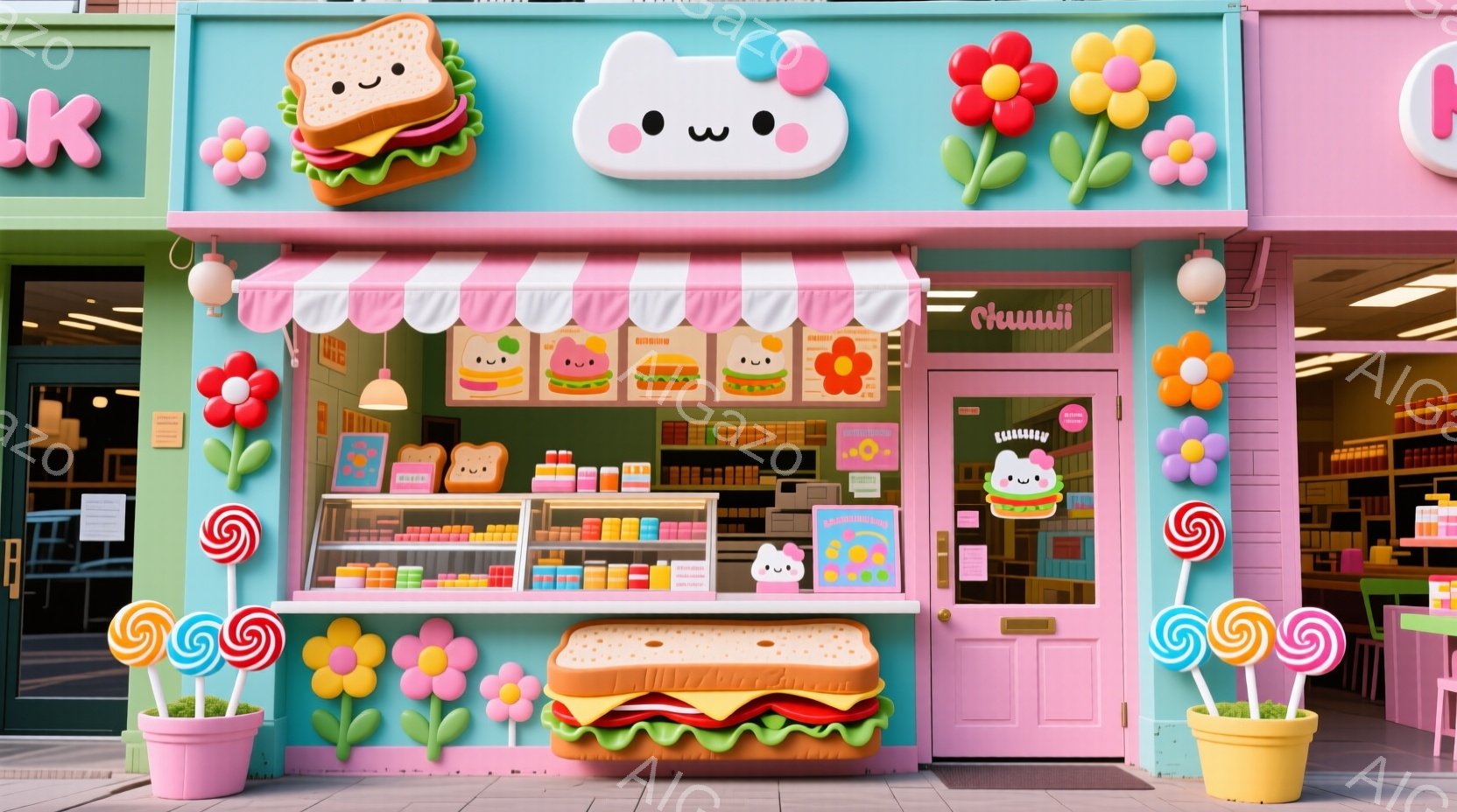 この無料AI生成画像「明るいピンク色の店が特徴的で、看板には「Kunii」と書かれています。店の上には大きなハンバーガーの模型があり、入り口の左右にはカラフルなキャンディと花が飾られています。全体的に可愛らしく、お菓子屋のような楽しい雰囲気が漂っています。」は、2025年10月23日に作成されました。 サイズは 1664×928px の高解像度で、商用利用も可能なフリー素材として提供しています。