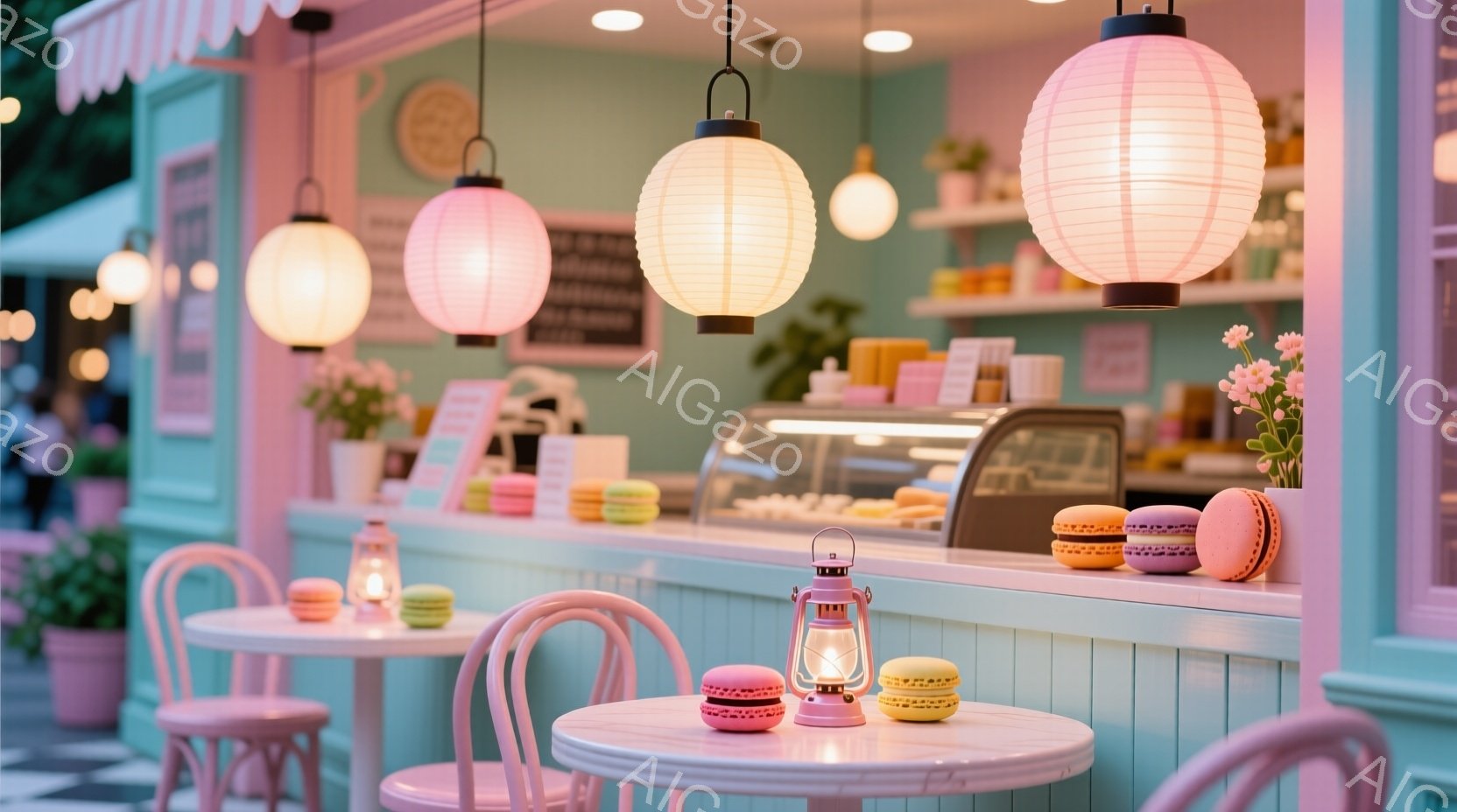 パステルカラーを基調とした、可愛らしいマカロン専門店です。テーブルには、ピンク色のマカロンが飾られており、壁は水色、天井は薄いピンク色で統一されています。店内の照明は柔らかく、温かい雰囲気で、まるでフランスのパティスリーのような上品さを感じさせます。