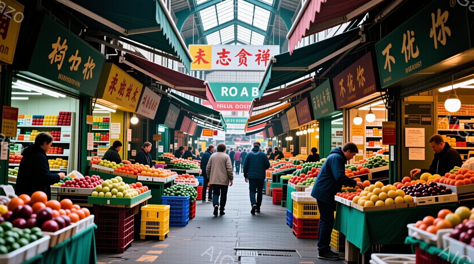 市場の通路は、様々な色の新鮮な果物や野菜で賑わっている。人々はカジュアルな服装で歩き回り、買い物や見物を楽しんでいるようで、穏やかで活気のある雰囲気が漂う。天井が高く、明るい光が差し込み、市場全体が開放的で魅力的な空間となっている。