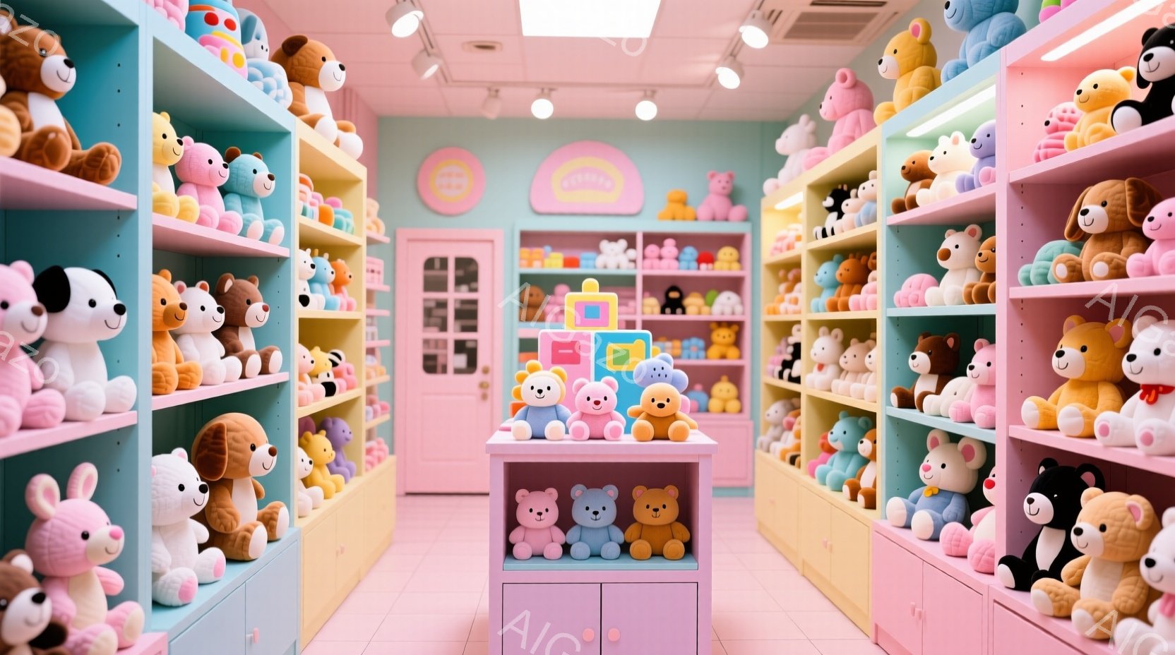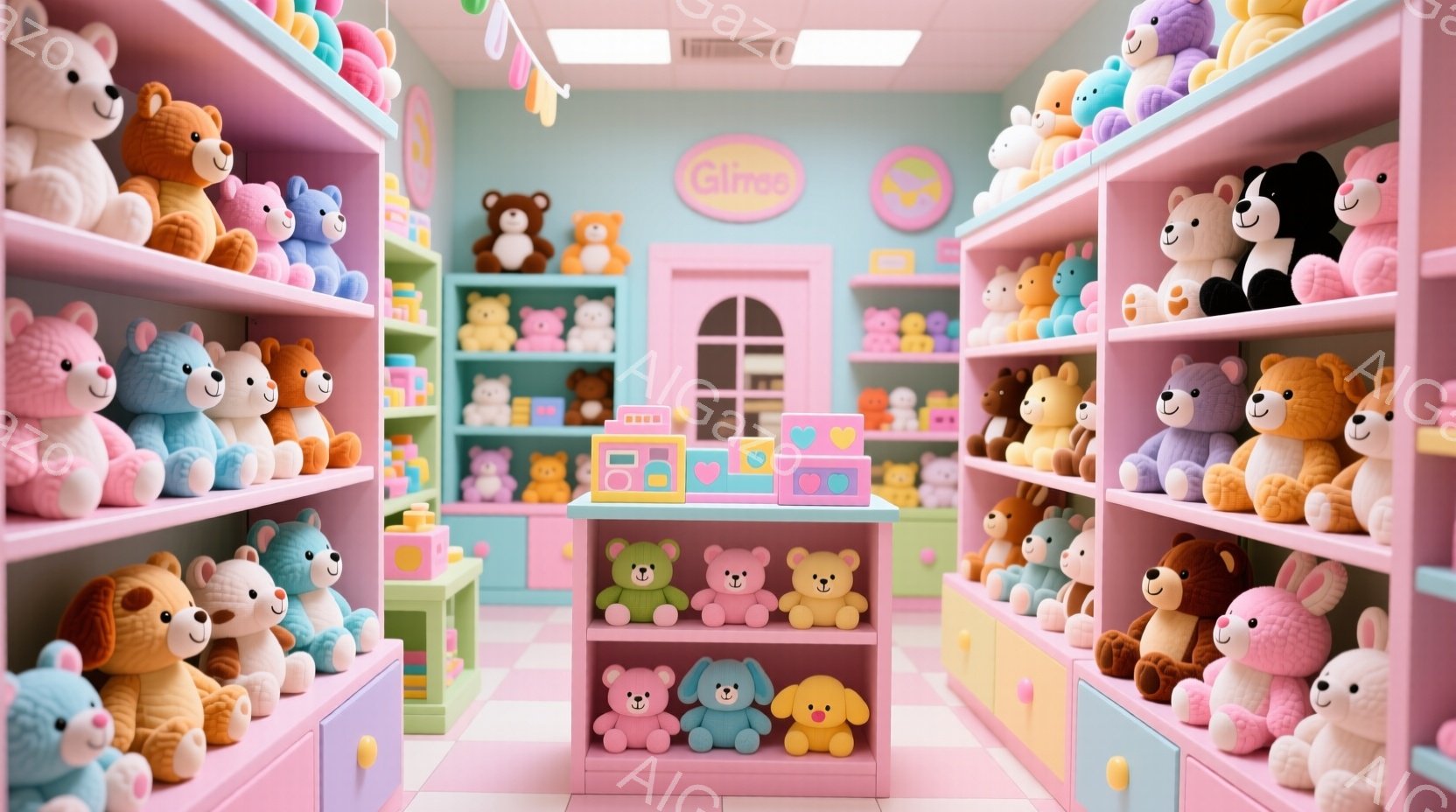 店内はパステルカラーで統一され、多くのテディベアが棚に並べられています。ベアたちは様々な色とポーズで、可愛らしい表情を浮かべており、まるでテディベア専門店のような雰囲気です。背景には窓があり、店内に柔らかい光が差し込み、暖かく優しい空間を作り出しています。