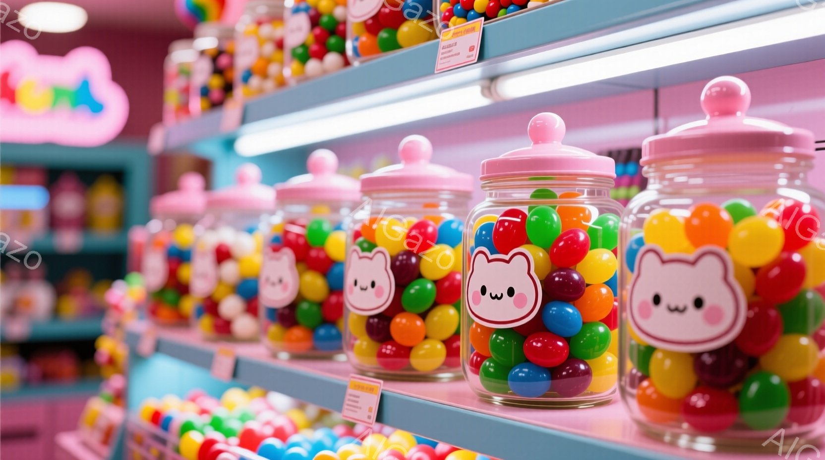 色とりどりのキャンディが透明な瓶にぎっしりと詰まっており、それぞれの瓶には可愛らしい笑顔の顔が描かれています。瓶はピンク色の棚に並べられ、背景にはさらに多くのキャンディが溢れています。全体的に明るく、甘くて楽しい雰囲気です。