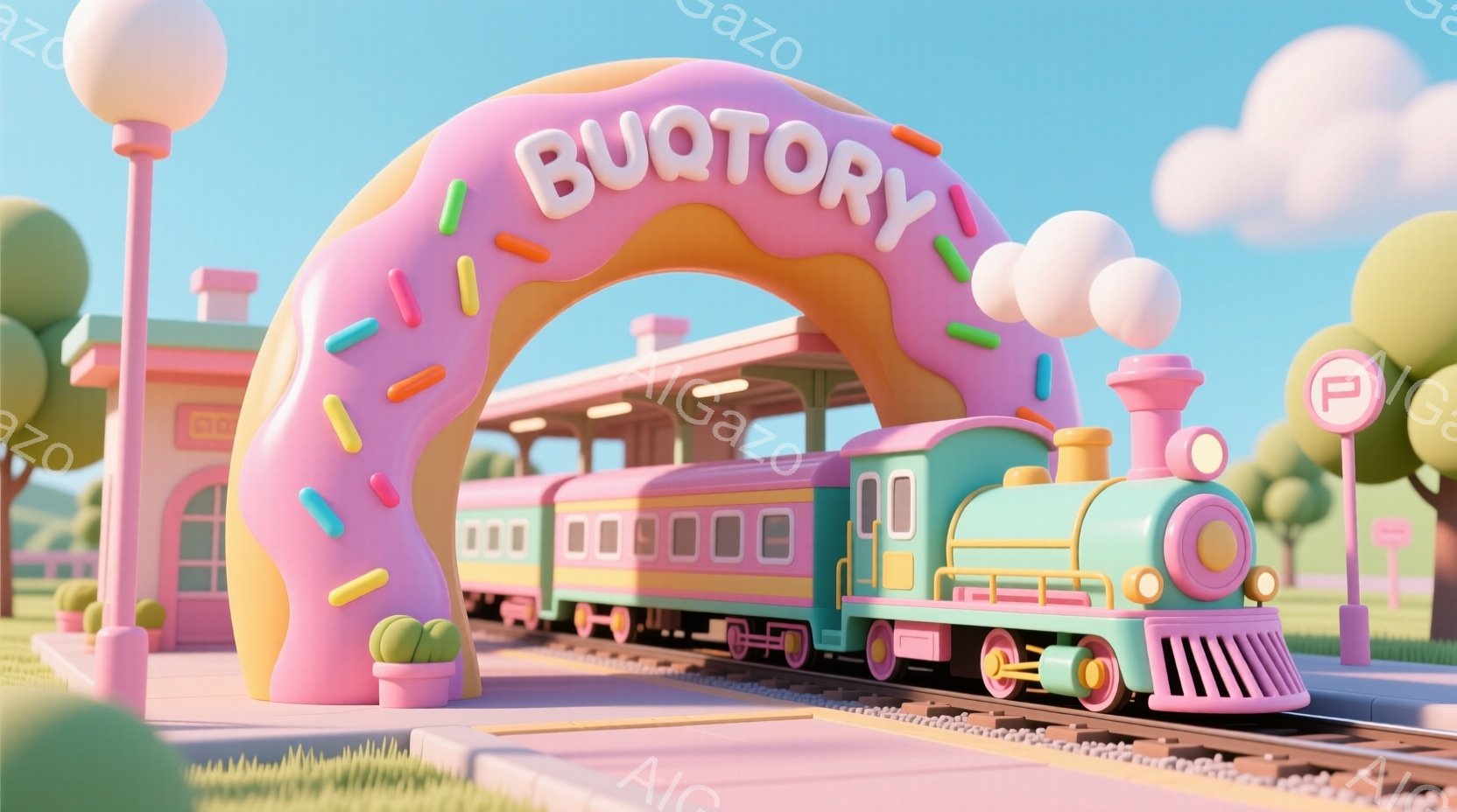 明るいピンクと水色の列車が駅に停車しており、巨大なピンク色のドーナツのアーチが列車の頭上をくぐるように設置されています。駅舎はパステルカラーで可愛らしいデザインで、背景には青空と雲が広がっています。全体的に明るく、夢のような、遊び心あふれる雰囲気です。
