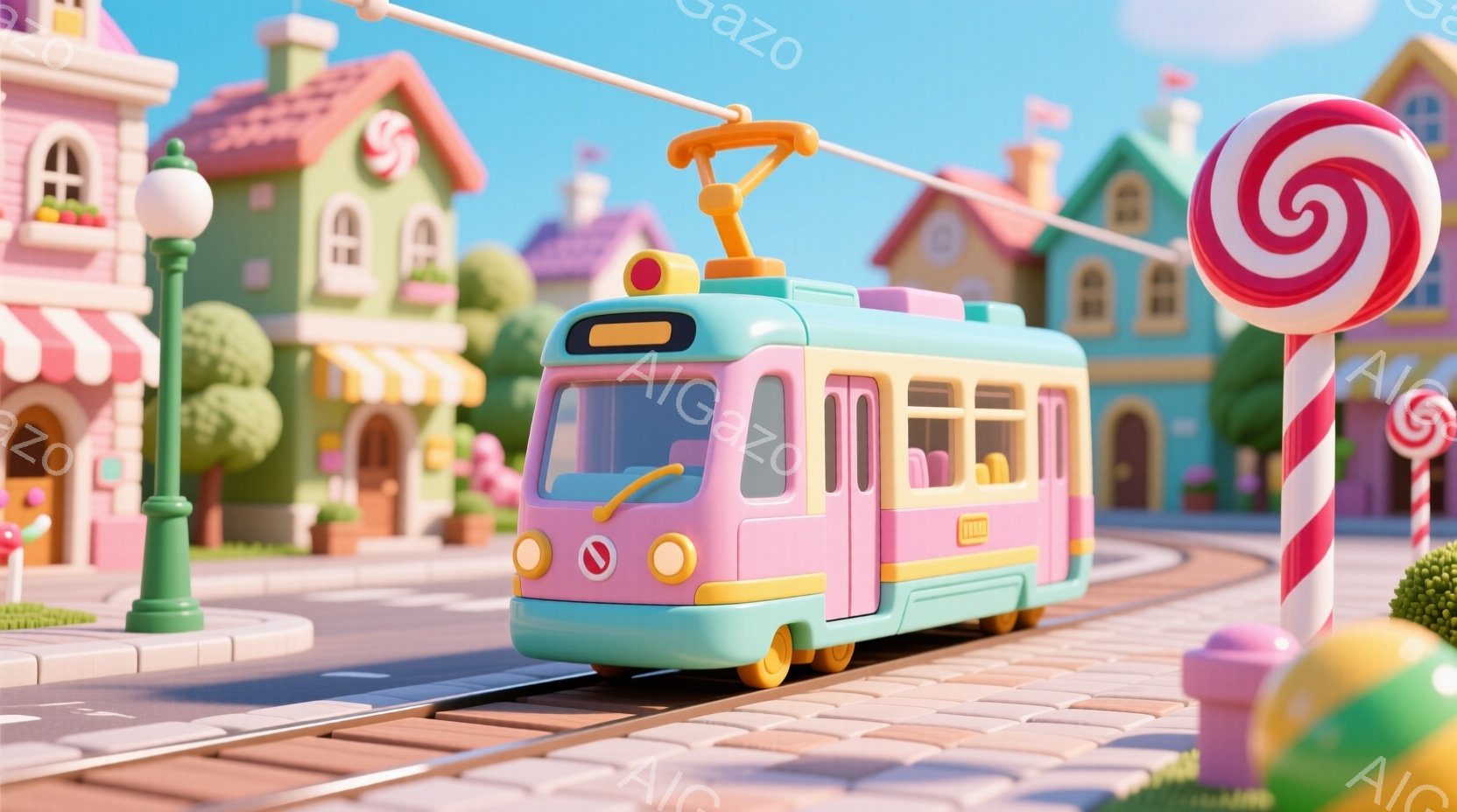 明るいピンク色の路面電車が、おもちゃのような可愛らしい街並みを走っています。背景にはカラフルな家々や、キャンディのような装飾が並び、まるで夢のような世界観です。全体的にパステルカラーで統一され、温かく優しい雰囲気が漂っています。