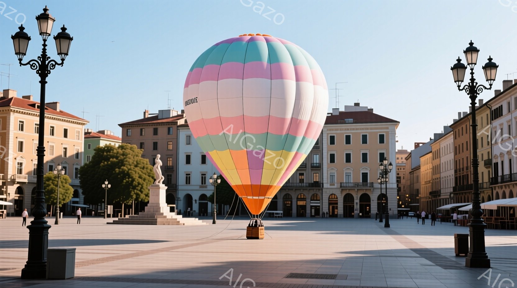 広場には大きな熱気球が浮かび、ピンク、白、オレンジのグラデーションが美しい。周囲にはヨーロッパ風の建物が並び、人々が散歩を楽しんでいる様子が見て取れる。晴れた空と石畳の広場が、穏やかで暖かい雰囲気を醸し出している。