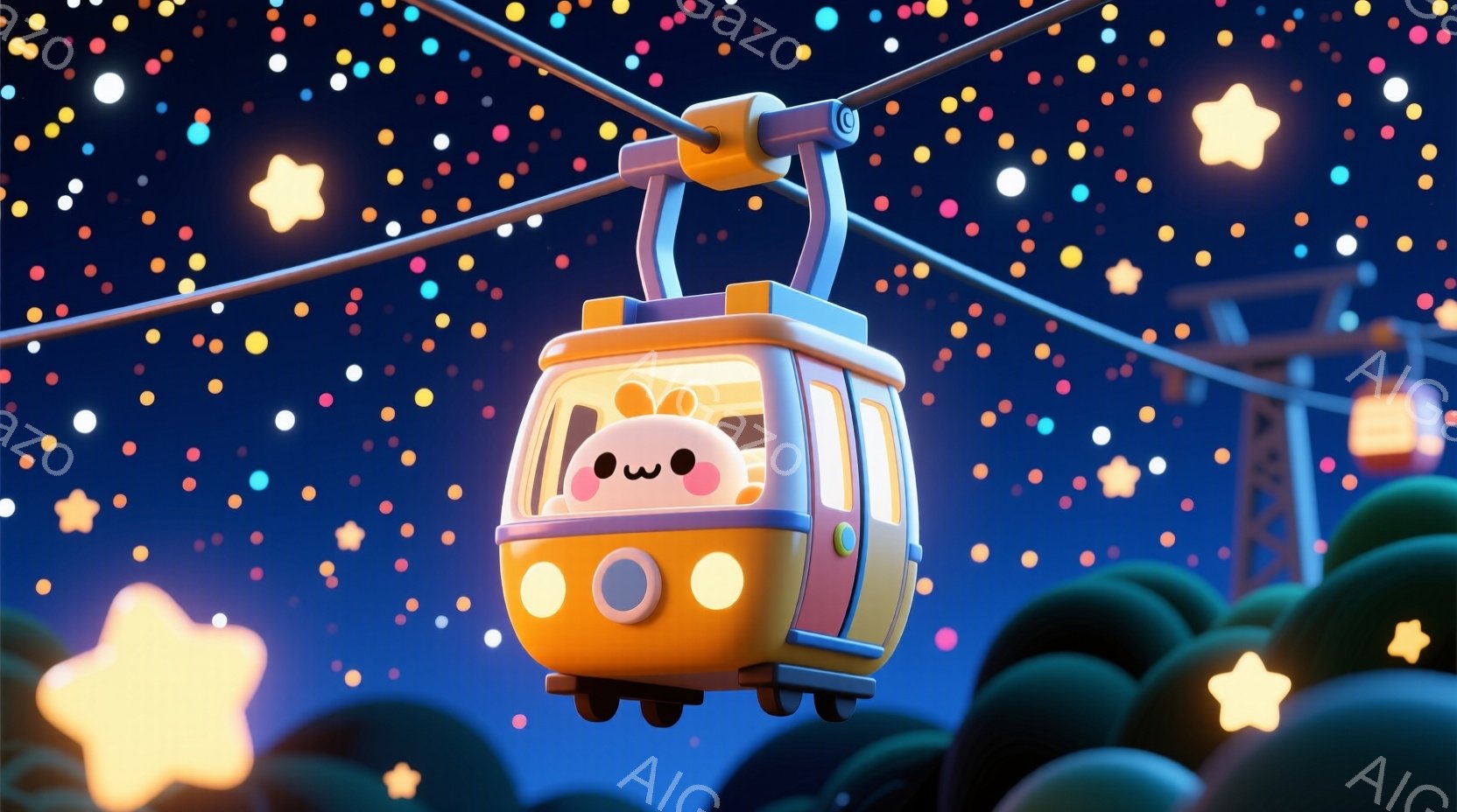 ケーブルカーは可愛らしい表情を持ち、丸みを帯びたクリーム色のボディに、明るい黄色い窓と光るライトが特徴です。背景には緑色の丘陵地帯と夜空に輝く星々が広がり、暖かく幻想的な雰囲気を作り出しています。ケーブルカーは鉄道の軌道上を滑らかに進んでおり、楽しさと冒険心をくすぐる様子が伺えます。