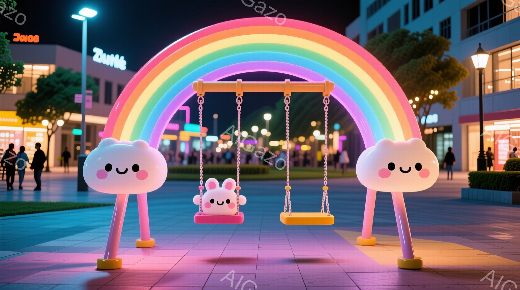 夜の街並みを背景に、虹色のブランコが設置されています。ブランコには、可愛らしい笑顔を浮かべた雲の形をしたクッションが吊り下げられており、ピンクと黄色の2つが存在します。背景には、明るい光を放つ店舗や街路樹が見え、幻想的な雰囲気を醸し出しています。