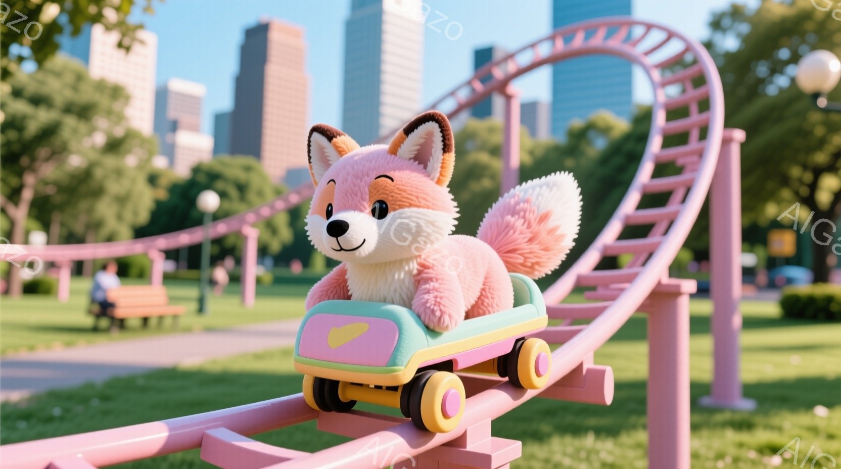 柔らかいピンク色の毛並みを持つぬいぐるみのようなキツネが、水色の遊園地コースターのレールの上を乗る車両に乗って移動している。背景には緑豊かな公園と、遠くに見える都市の建物群が広がっており、晴れた日の穏やかな雰囲気が感じられる。コースターの鮮やかな色彩と、キツネの愛らしい表情が、遊び心あふれる情景を作り出している。