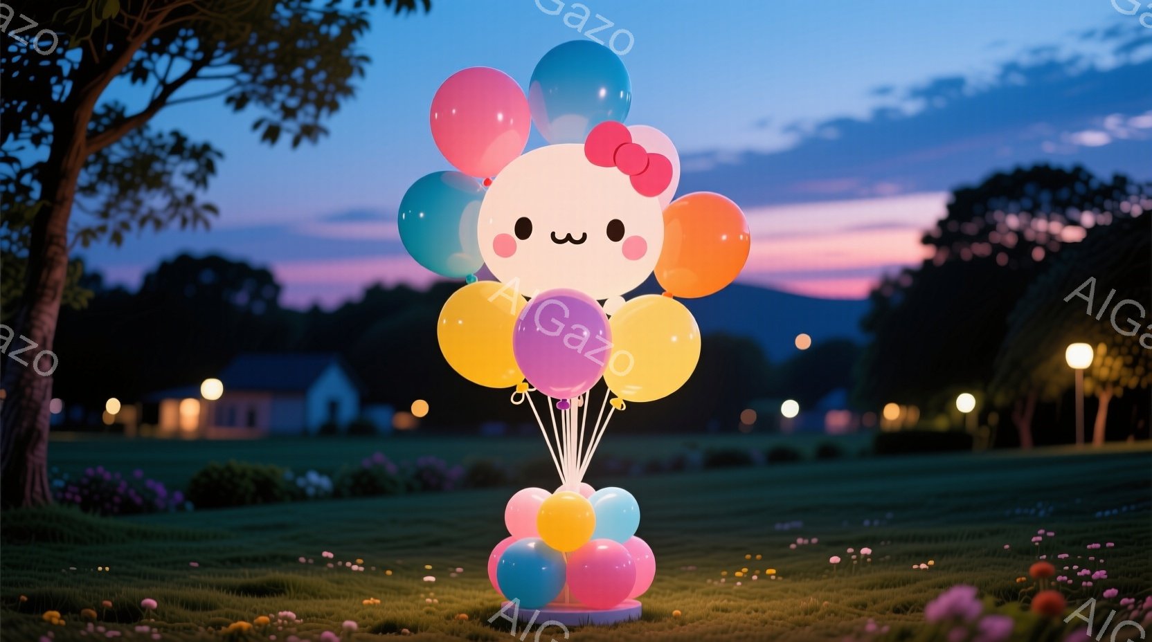 白い背景に、ピンクのリボンをつけた可愛らしいキティちゃんが立っており、たくさんのカラフルな風船に支えられています。キティちゃんは微笑んでおり、その下には緑の草地と小さな花々が広がっています。背景には、夕焼け空と遠くの山々が見え、幻想的で平和な雰囲気を醸し出しています。