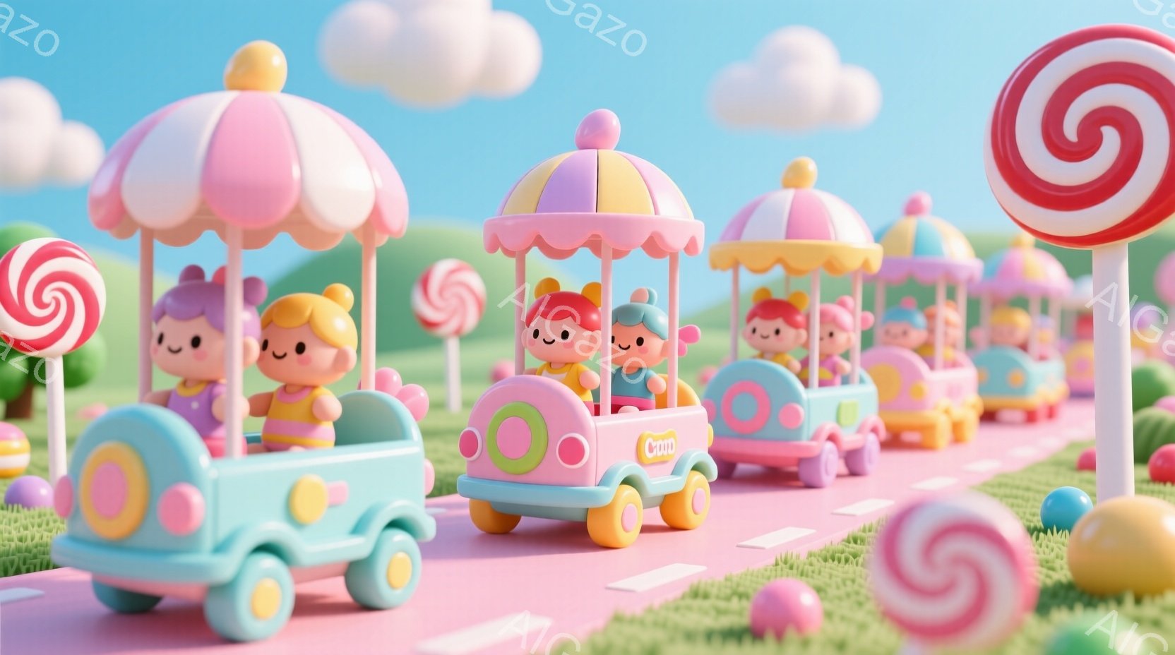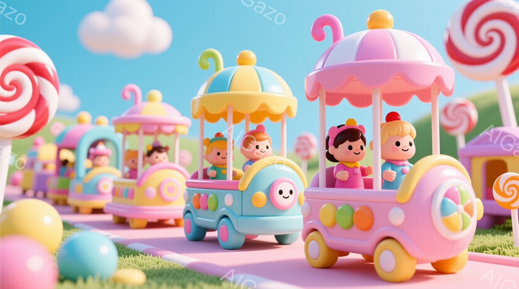 カラフルなキャンディの世界を模した遊園地のような風景が広がっています。小さな子供たちが、それぞれピンクと水色の可愛い車に乗って遊んでいます。背景には巨大なキャンディやカラフルなボールが散りばめられており、全体的に明るく、夢のような雰囲気です。