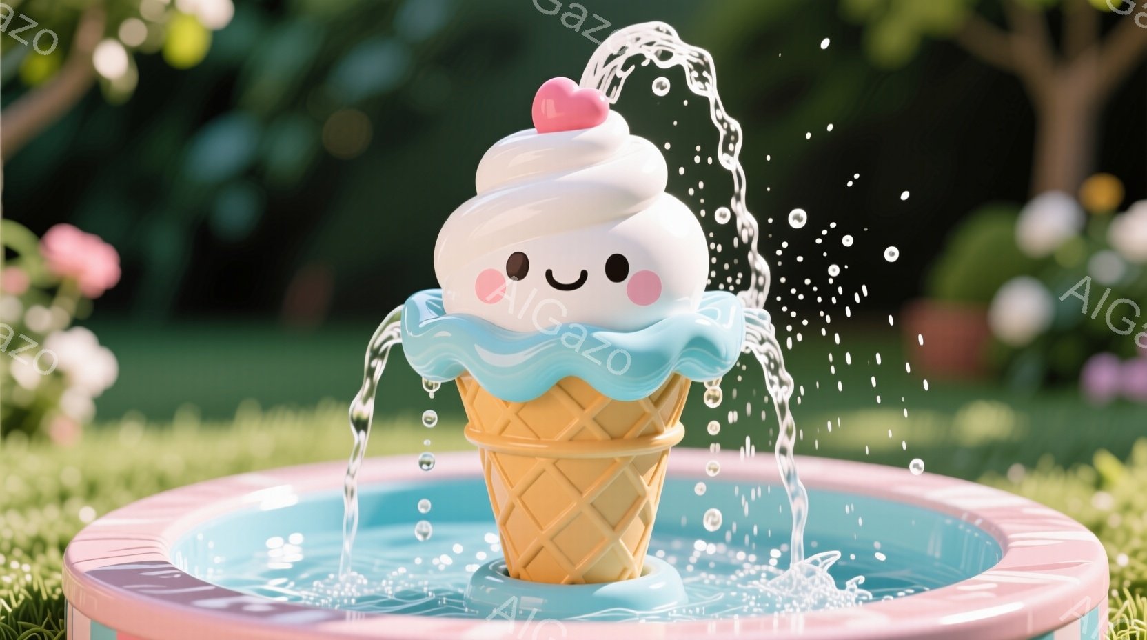 鮮やかなピンク色の縁取りのある円形の噴水の中に、可愛らしいアイスクリームが立っています。アイスクリームはコーンと、上には赤い果実とカラフルなトッピングが飾られており、愛らしい表情をしています。背景には、植物や花が咲き乱れ、おとぎ話のような雰囲気で、明るく暖かい日差しが差し込んでいます。