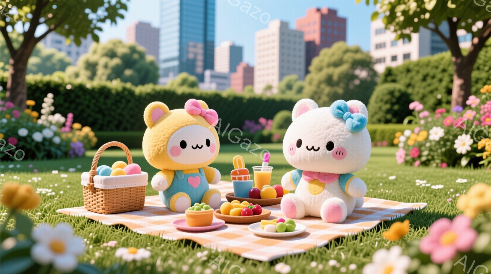 広大な緑の芝生の上で、カラフルな凧が空高く舞っている。人々はカジュアルな服装で、白いTシャツや短パンを着て、凧揚げを楽しんでいるようだ。背景には高層ビル群が立ち並び、晴天の下、活気あふれるイベントの様子がうかがえる。