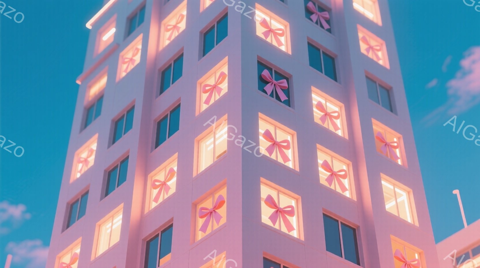 白い高層ビルが、各窓に大きなピンクのリボンが飾られており、まるでプレゼントのように見えます。夕暮れ時の空は淡い青色で、ビルの明かりが温かく光り、夢のような雰囲気を醸し出しています。ビルの隣には、シルエット状の別の建物が見え、静かで穏やかな夜の情景が表現されています。