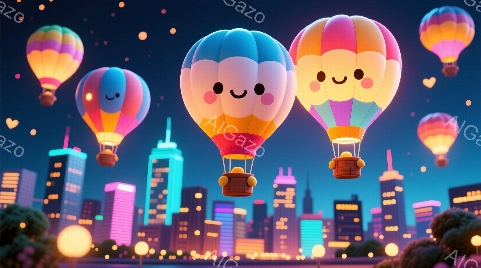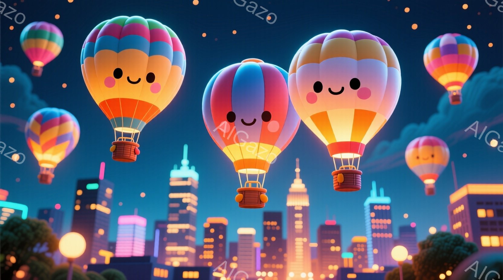 空には、カラフルで愛らしい表情をした熱気球が複数浮かんでおり、それぞれが独特の色合いとデザインを持っています。下には、夜景の美しい都市が広がっており、建物は明るい光で照らされ、暖かく幻想的な雰囲気を醸し出しています。全体的に、穏やかで夢のような、遊び心あふれる空気が感じられます。
