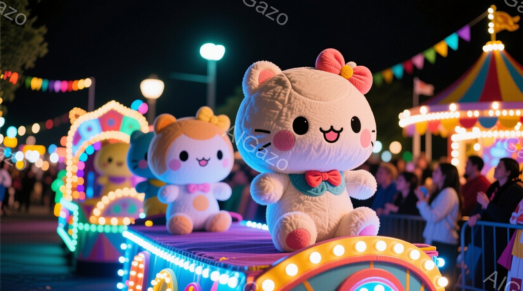 ふわふわしたパステルブルーと茶色のぬいぐるみは、遊園地のカラフルな乗り物の上に乗っています。ぬいぐるみはそれぞれ赤いリボンと星の飾りを身につけ、愛らしい表情をしています。背景には、夜空に輝く様々な光の遊具や、ぼんやりとした人々の姿が見え、楽しげな遊園地の雰囲気が漂っています。