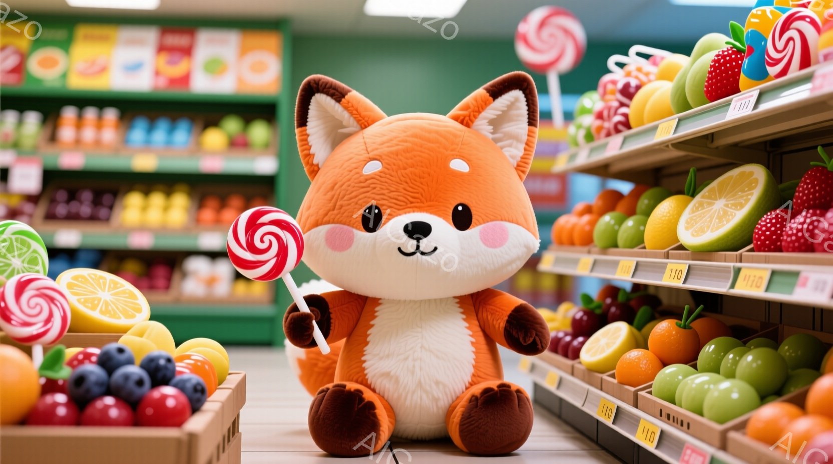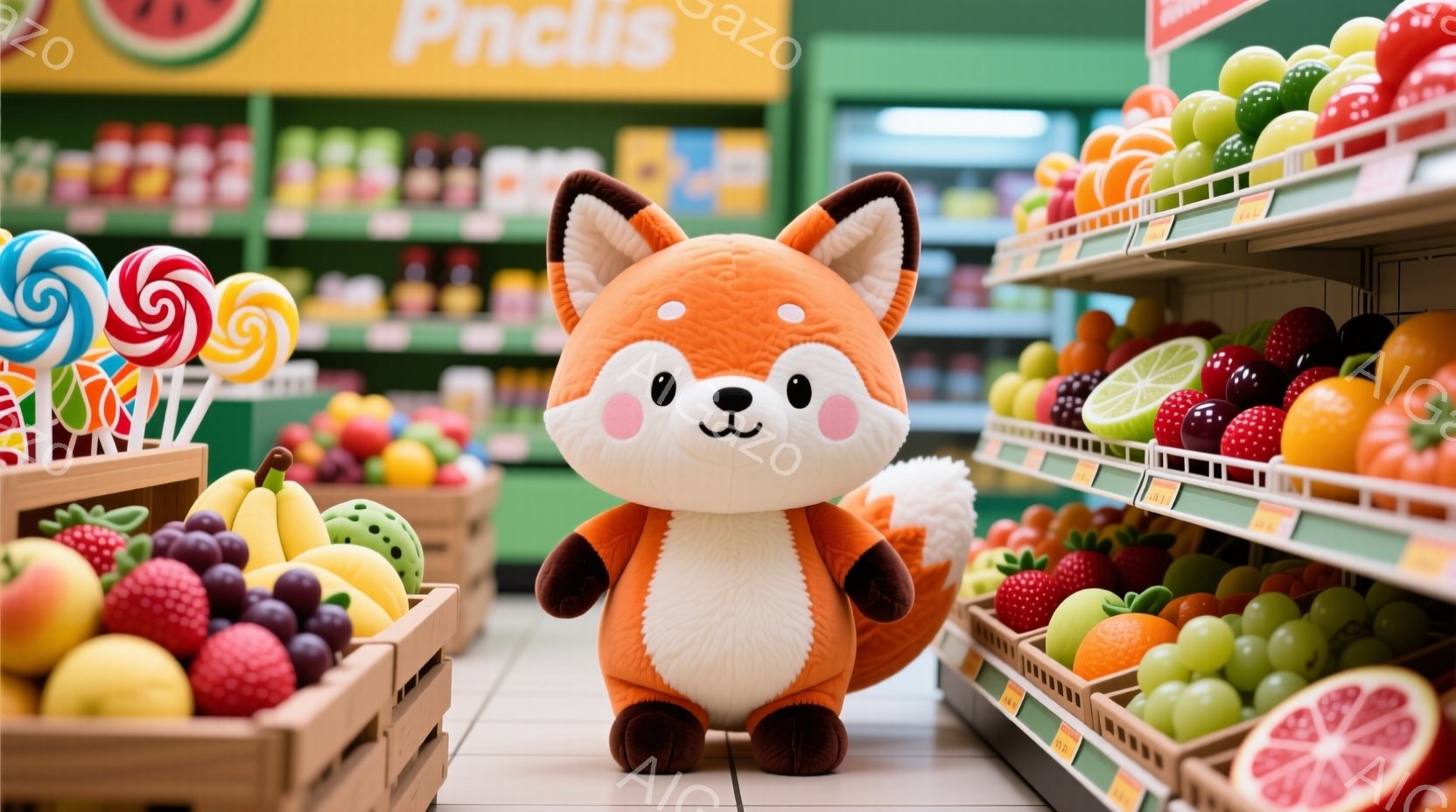 オレンジ色のふわふわしたキツネのぬいぐるみは、手にキャンディを持って、果物の陳列棚の前で座っています。背景には、さまざまな種類の果物、例えばバナナ、イチゴ、オレンジなどが並び、明るく活気のある食料品店の雰囲気が漂っています。全体的に、かわいらしいキツネとカラフルな果物が組み合わさり、温かくて楽しい印象を与えています。