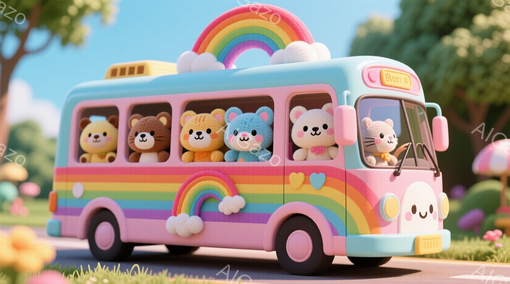 カラフルなミニバスが、可愛らしい動物たちでいっぱいになっています。動物たちは皆、窓から顔を出し、楽しそうにしています。背景には虹、花、そして晴れた空が広がっており、全体的に明るく、楽しい雰囲気が漂っています。
