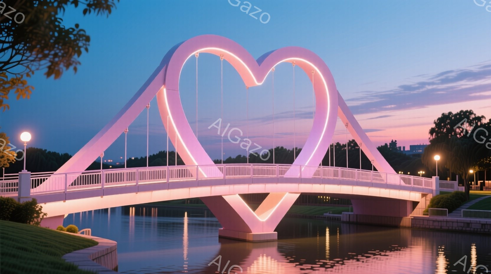 この無料AI生成画像「ハート型のライトアップされた橋が、穏やかな水面に映り込んでいます。背景には緑豊かな木々と、遠くに見える街の灯りが広がっており、夕暮れ時の穏やかでロマンチックな雰囲気を醸し出しています。水面には橋の美しい反射が広がり、幻想的な光景を作り出しています。」は、2025年10月23日に作成されました。 サイズは 1664×928px の高解像度で、商用利用も可能なフリー素材として提供しています。
