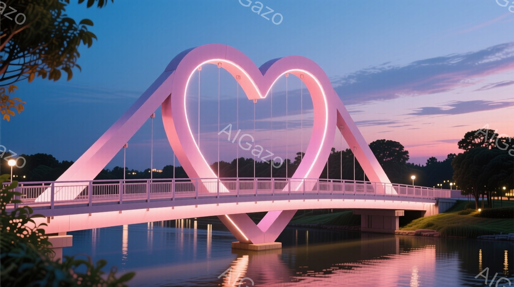 ハート型のライトアップされた橋が、穏やかな水面に映り込んでいます。背景には緑豊かな木々と、遠くに見える街の灯りが広がっており、夕暮れ時の穏やかでロマンチックな雰囲気を醸し出しています。水面には橋の美しい反射が広がり、幻想的な光景を作り出しています。