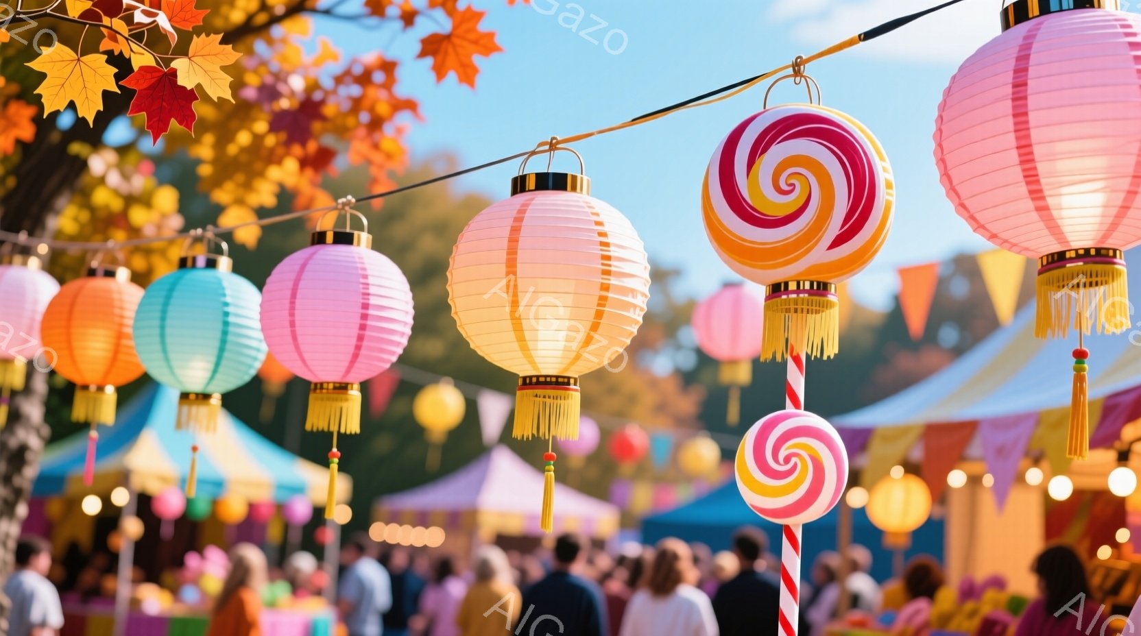 色とりどりの提灯が空中に並び、お祭りの賑やかな雰囲気を醸し出しています。人々は後ろ姿でしか見えず、楽しげなお祭りの一角に集まっている様子が伺えます。背景には、白とピンクのテントや緑豊かな木々が見え、秋の夕暮れ時の温かい光が全体を包み込んでいます。