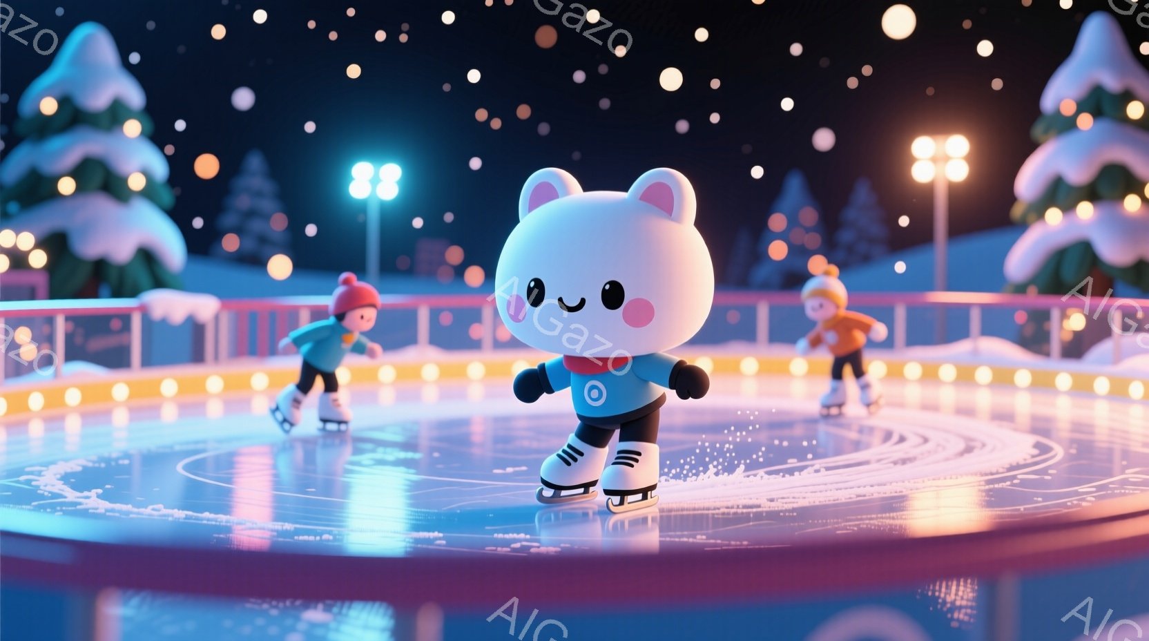 雪が降る夜のスケートリンクで、可愛らしいウサギのキャラクターがスケートを楽しんでいます。青いパーカーと赤いスケート靴を身に着け、満面の笑顔で滑走しています。背景には雪景色と、光り輝く建物や街灯があり、幻想的な雰囲気を醸し出しています。