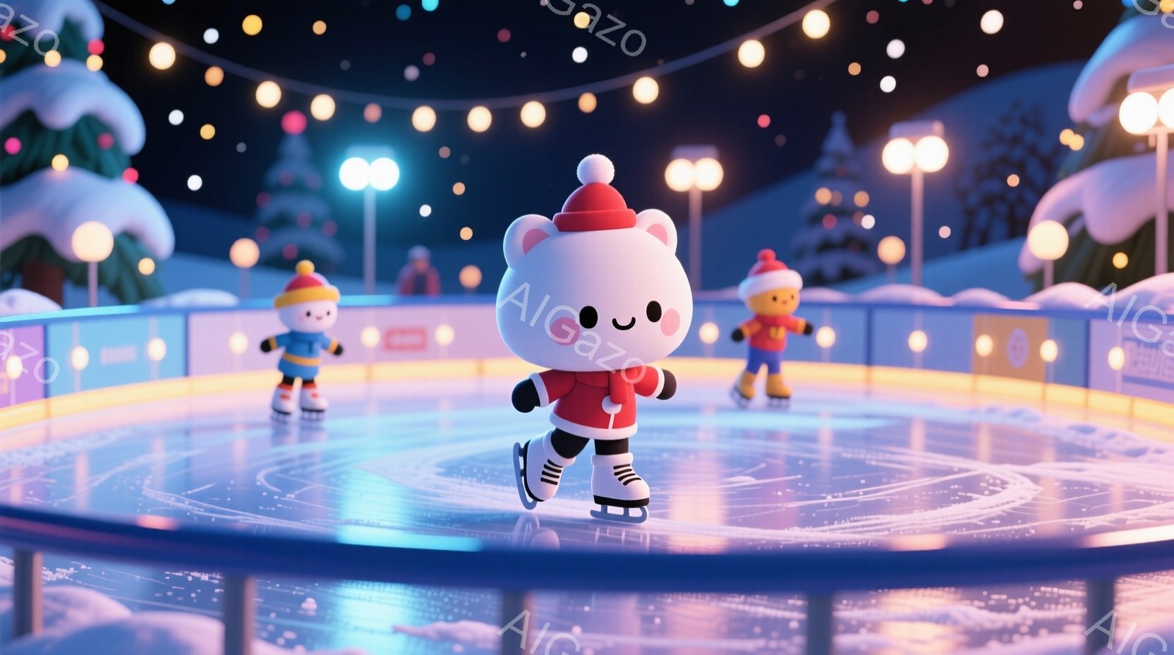 真っ白なアイススケートリンクで、かわいらしいクマのキャラクターがスケートを楽しんでいます。赤いマフラーと青いジャンパーを着て、笑顔で滑る姿はとても愛らしいです。背景には雪で覆われた木々と、リンクを照らす光が点在し、冬の幻想的な雰囲気を醸し出しています。