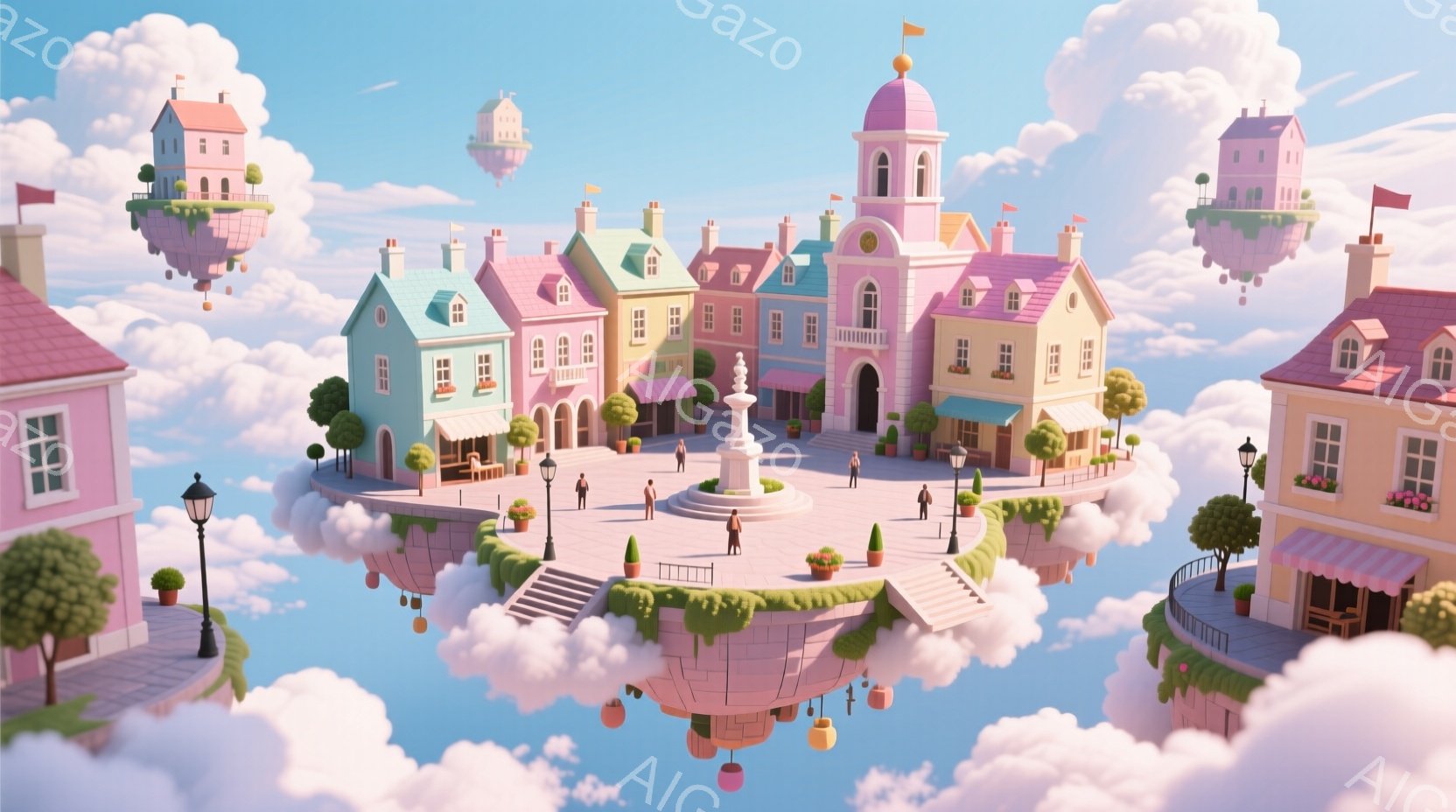 空に浮かぶ、パステルカラーの可愛らしい街並みが描かれています。建物は明るいピンク、水色、黄色などで彩られ、彫刻が中央の広場に立っています。人々はカジュアルな服装で、散歩を楽しんだりベンチでくつろいだりしており、全体的に穏やかで夢幻的な雰囲気が漂っています。