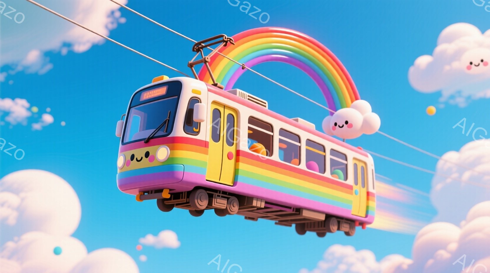 カラフルな電車のイラストで、車体は虹色に彩られています。車両には可愛らしい顔が描かれており、前方のヘッドライトは丸みを帯びた目になっています。背景は青い空と白い雲で、まるで夢のような、明るく楽しい雰囲気が漂っています。