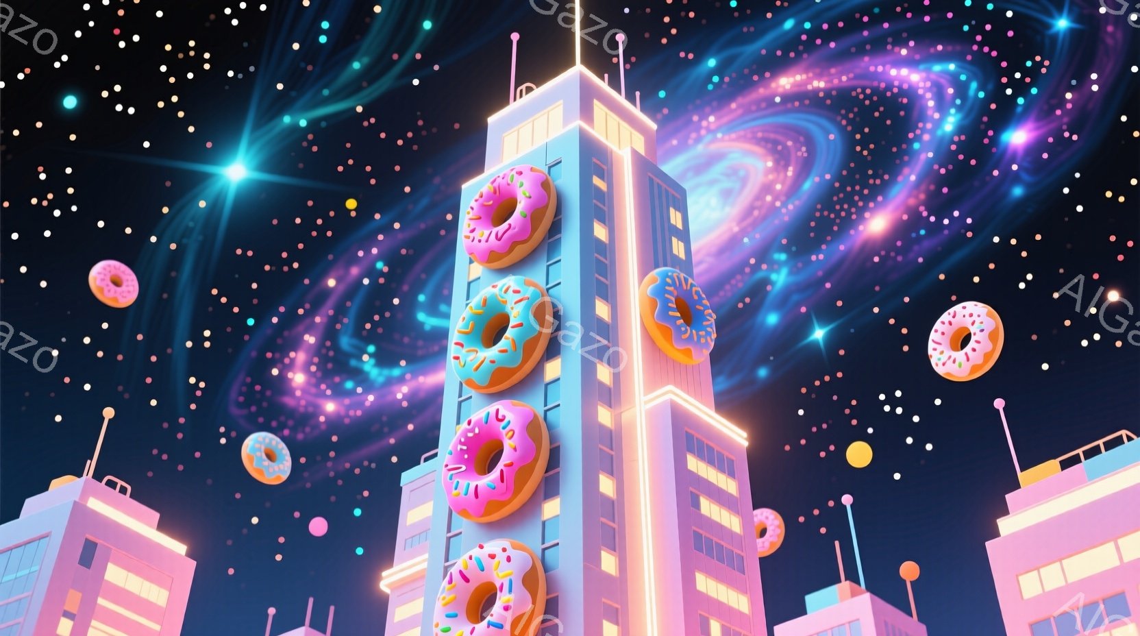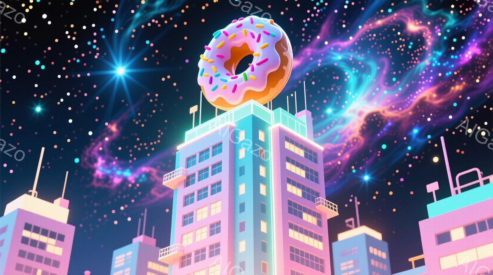 鮮やかなピンクと水色の建物が、夜空に浮かぶドーナツを模した装飾が施され、まるでファンタジー都市のような雰囲気を醸し出しています。背景には、紫とピンクの星雲が広がり、星が散りばめられており、まるで宇宙空間に都市が浮かんでいるかのような幻想的な光景です。全体的に明るく、遊び心のある色彩が、夢のような雰囲気を強調しています。