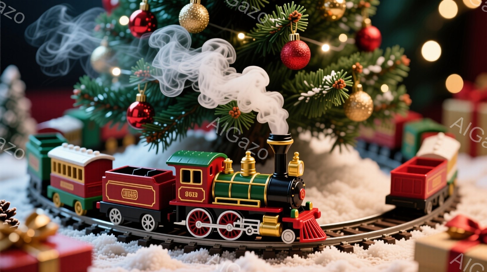 クリスマスツリーを背景に、緑と赤の小さな蒸気機関車が雪の敷かれた線路を走っています。機関車からは白い煙が立ち上り、線路の周りにはカラフルなプレゼントボックスが置かれています。暖かく、お祝いの雰囲気で、クリスマスの喜びを表しています。