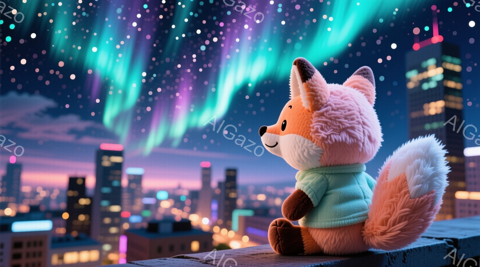 ピンク色のふわふわしたキツネのぬいぐるみは、薄緑色のセーターを着て、高い建物の縁に座って夜景を眺めている。背景には、都市の明かりが輝き、オーロラのような美しい光が空を彩っている。全体的に、暖かく、幻想的な雰囲気で、見る人に安らぎを与えるようなイメージである。
