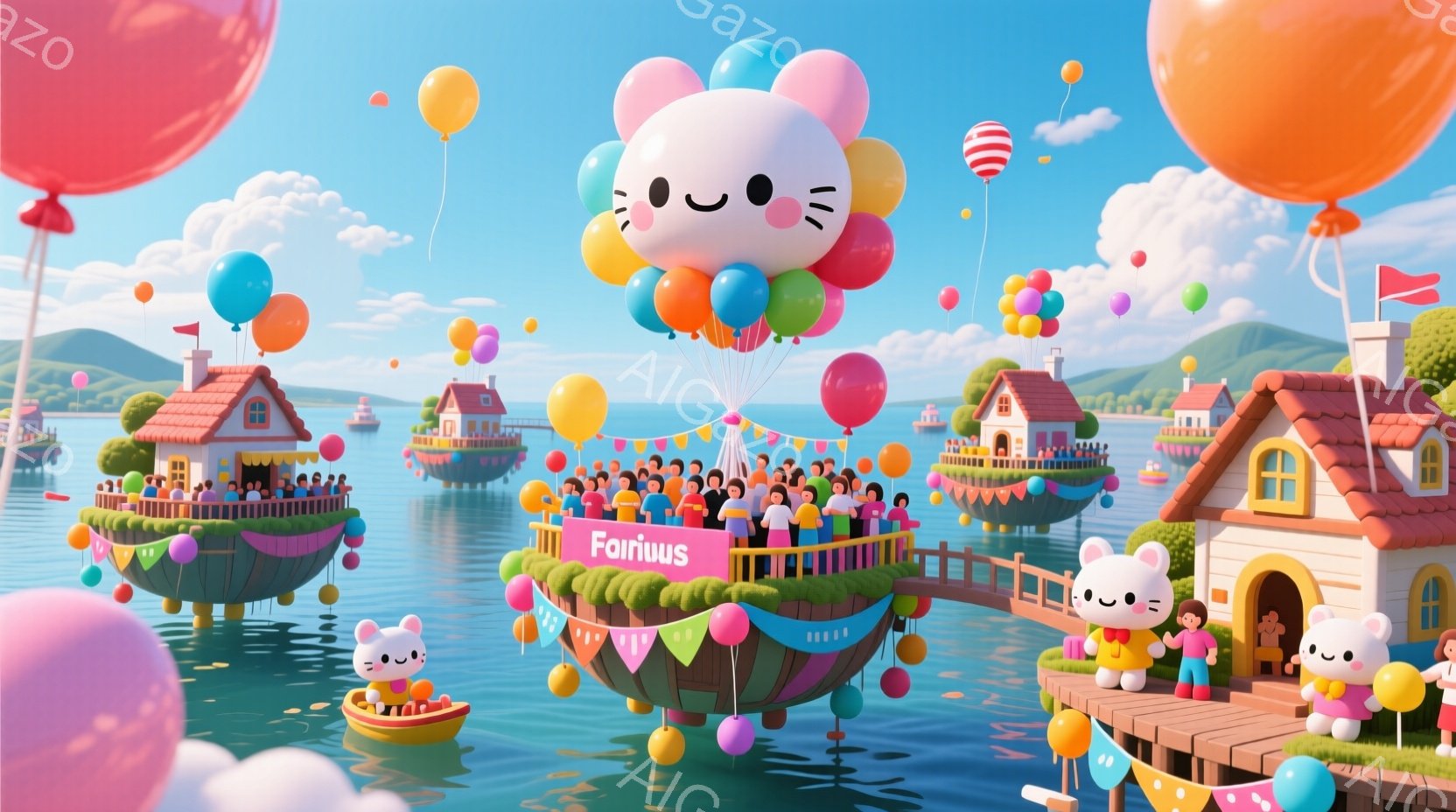 カラフルな風船が多数浮かび、その下に可愛らしい表情のキャラクターたちが密集しています。彼らは皆、単純な形と穏やかな表情をしており、まるで小さな祭りのようです。背景には、パステルカラーの可愛らしい家々が浮かぶ島々が並び、穏やかな海と青空が広がっており、全体的に明るく、夢のような雰囲気が漂っています。