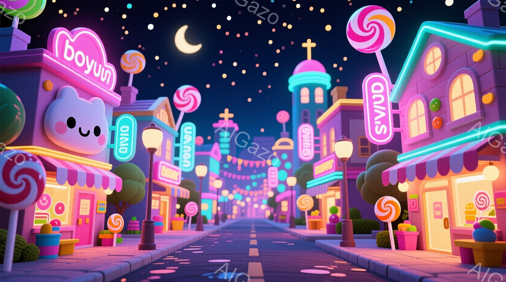 カラフルなキャンディランドの街並みが、夜空の下に広がっています。建物はパステルカラーで、キャンディやロリポップをモチーフにした装飾が施され、可愛らしい雰囲気を醸し出しています。道路には、カラフルな丸いものが点在し、夜空には星が輝き、夢のような世界観を作り出しています。