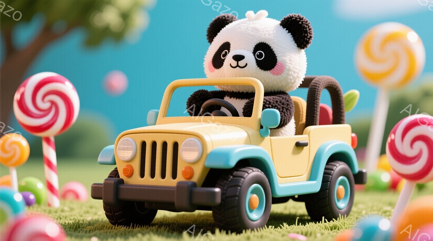 パンダの人形が水色のジープを運転している様子が描かれています。周囲にはカラフルなキャンディーが咲き乱れ、まるで遊園地のような背景です。ジープは道路を走り、パンダは楽しそうな表情でハンドルを握っています。