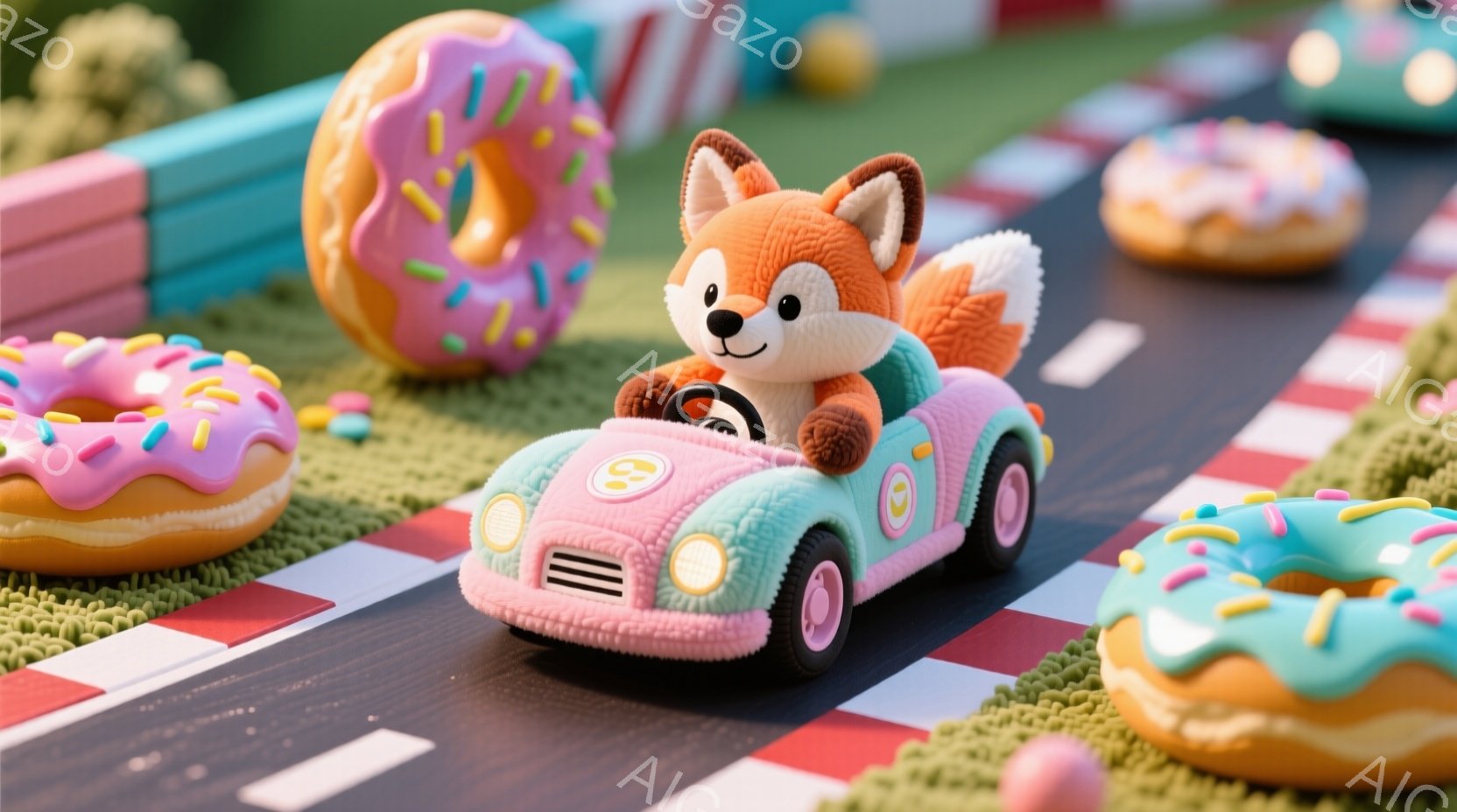 明るい緑色のクラシックカーを運転する、ふわふわの茶色のキツネが描かれています。キツネは嬉しそうに笑っており、ピンク色のストライプとドーナツで飾られた遊び心のあるコースを走っています。背景には、パステルカラーの建物と空があり、全体的に遊び心があり、夢のような雰囲気が漂っています。