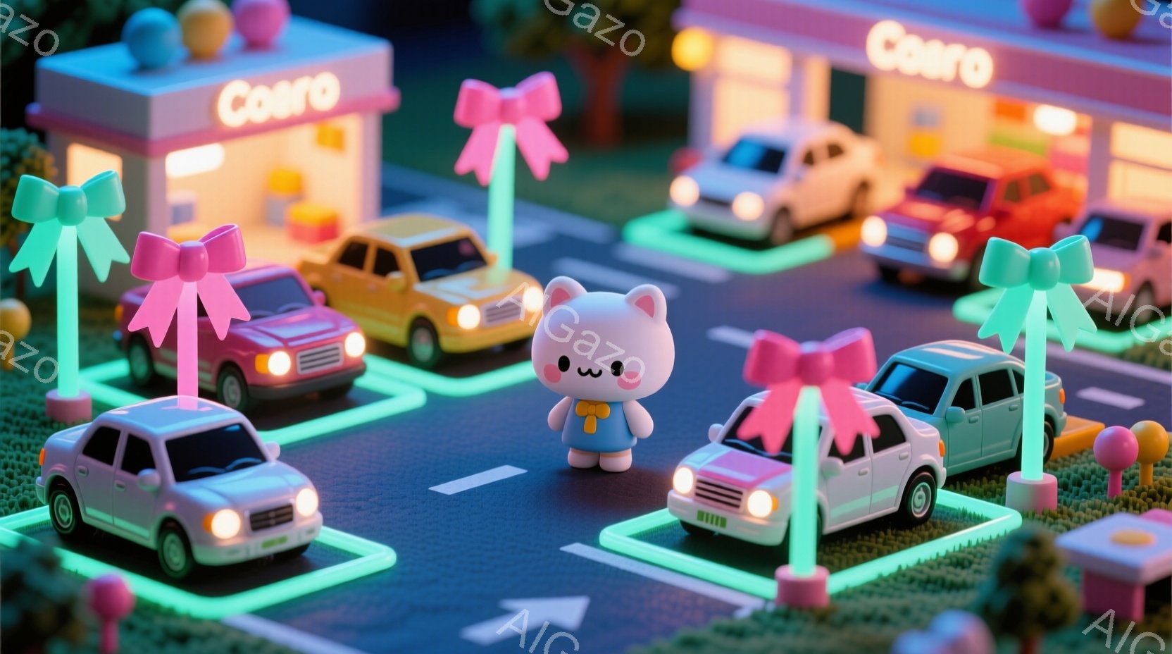 明るいピンク色の車が、可愛らしい表情で道路を走っています。背景にはパステルカラーの建物やヤシの木、そして夜の空を模したような暗い青色の背景が見られ、全体的に夢のような雰囲気です。道路標識や芝生もカラフルで、まるでミニチュアの世界に入り込んだようです。