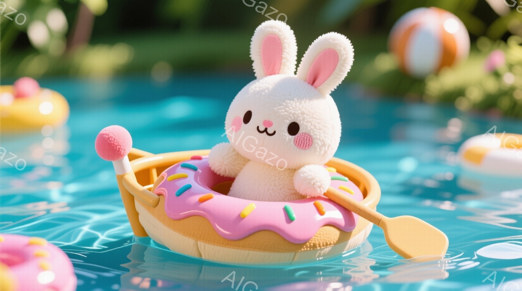 ふわふわの白いウサギが、ピンク色のドーナツ浮き輪に乗って水面を漂っています。ウサギは小さなオールを持っており、笑顔で漕いでいるようです。背景には他のカラフルな浮き輪やヤシの木が見え、晴れた日の穏やかな夏の雰囲気が漂っています。